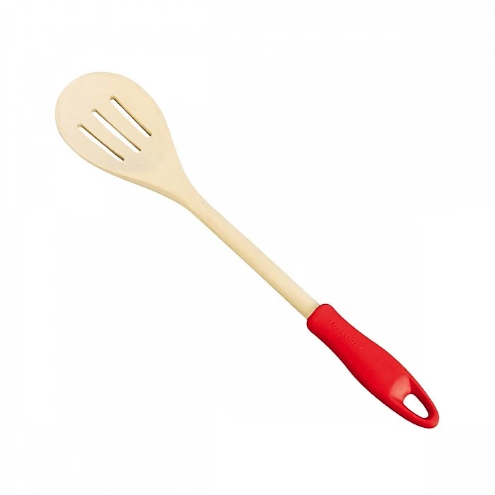 Łyżka ażurowa wykonana z wysokiej jakości drewna bukowego zakończona antypoślizgową rączka silikonowa to świetny produkt do codziennego domowego użytku.